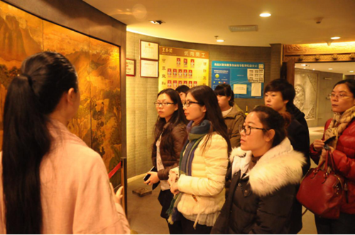 在主持人周霞(国学班负责人)介绍完此次活动的背景后,大益皇茶会茶艺师周梦琳带领全体学员参观皇茶会内设的七个茶室和大型“世外茶苑”漆画。茶室分别以“琴”、“棋”、“书画”、“禅”、“京剧”等为主题,本身已是茶与国学的结合。
